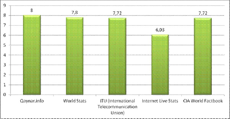 По различным данным, которые приводит главный редактор Qaynar.info Захир Азамат, число активных Интернет пользователей составляет 6-8 млн. Так, согласно информации World Stats - 7.8 млн; ITU (International Telecommunication Union) - 7.72 Internet Live Stats - 6.03 млн., CIA World Factbook- 7.72 млн.