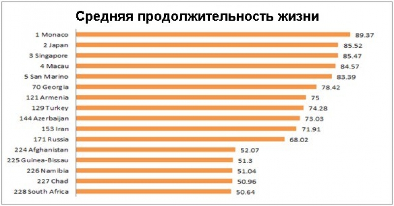 На Южном Кавказе картина средней продолжительности жизни такова: в Грузии – 78 (70  место в таблице рейтингов),  в Армении – 75 лет, в Азербайджане – 73 года (144 место). Это говорит, прежде всего, о том, что мы не смогли трансформировать преимущества ресурсной экономики в  продолжительность человеческой жизни.